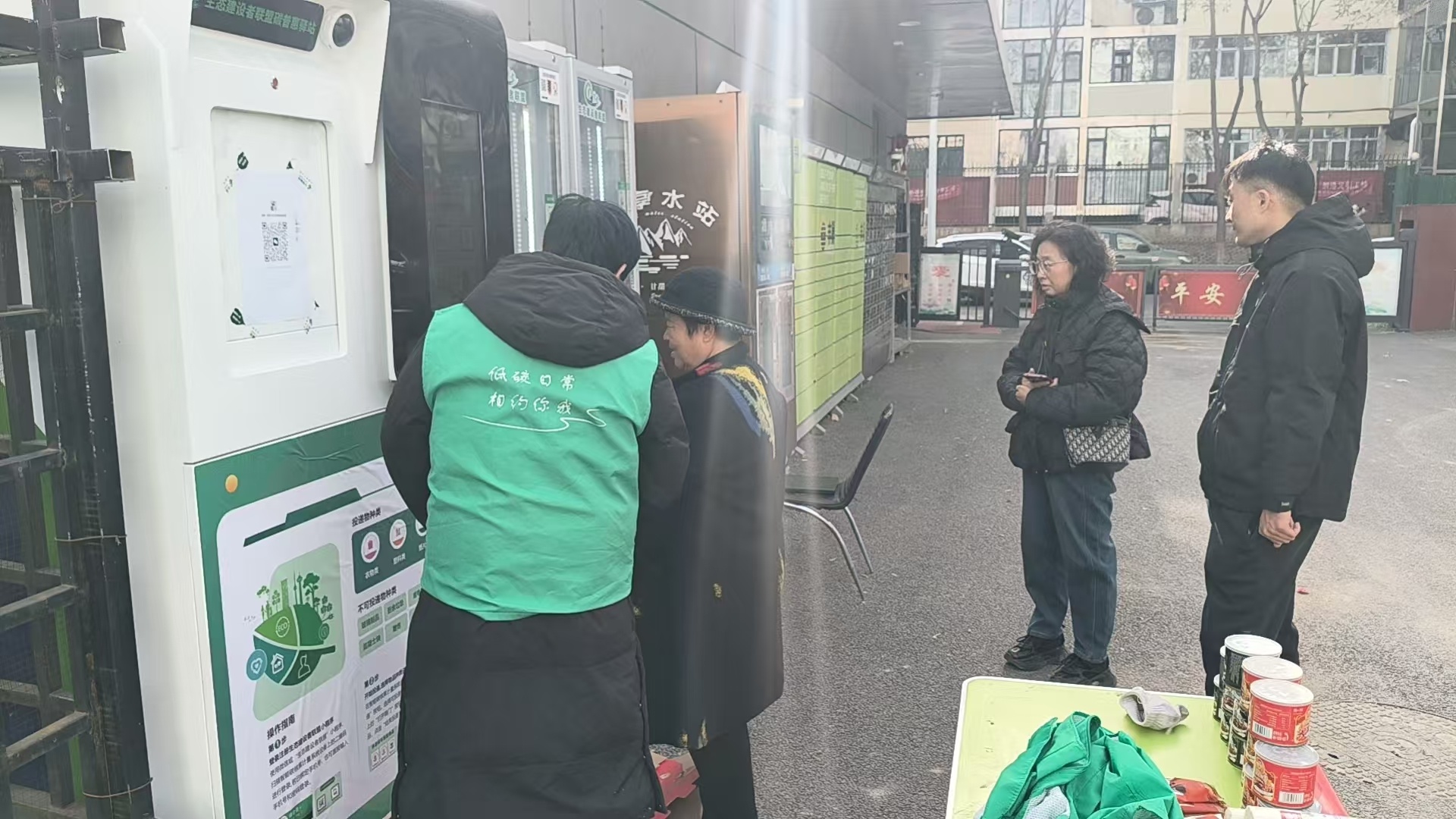 图为碳普惠团队成员为环保小区居民讲解碳普惠设备的功能及使用流程。